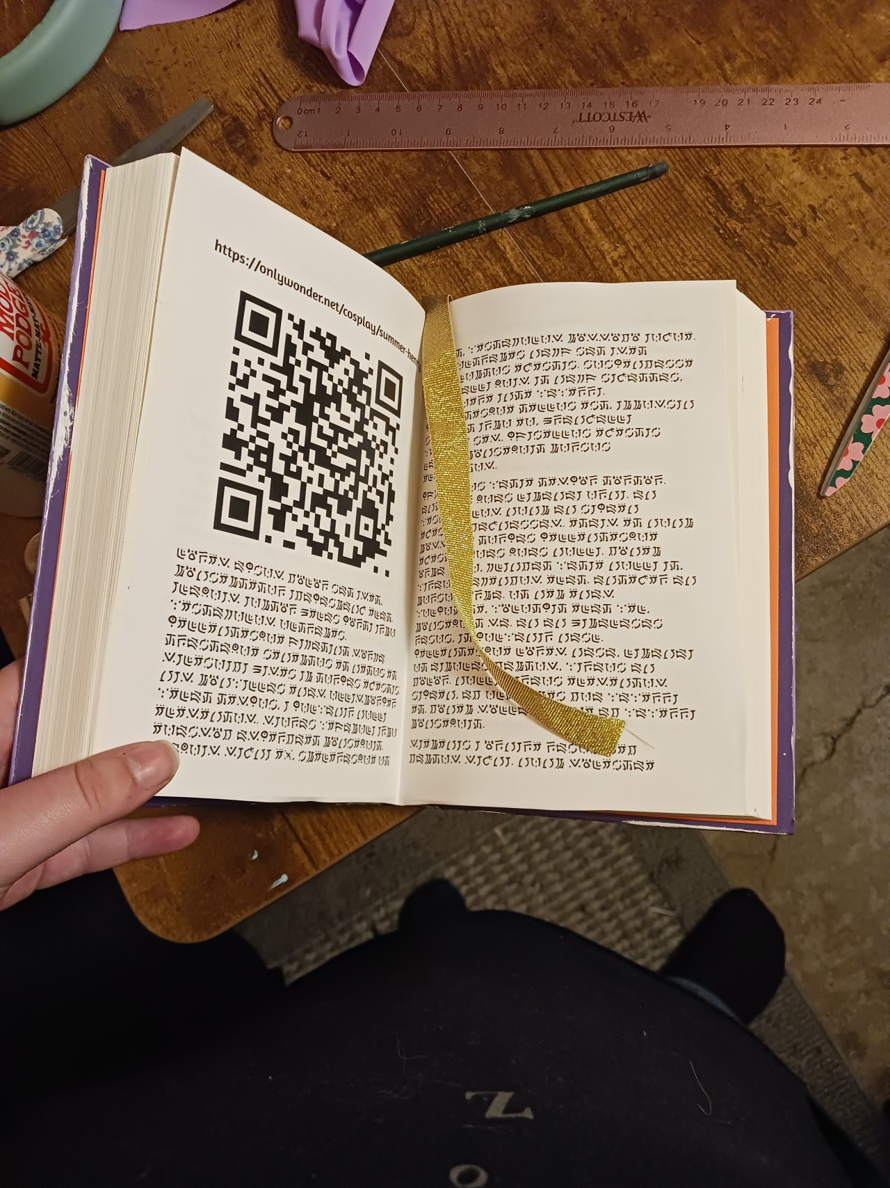 Due to crunching, I keep forgetting to take progress pics of me trying stuff on. I do however have a few pics of the cover of the Tome/book & the interior page that it will (hopefully) flip to easiest. I printed off a qr code that (hopefully) got the judges to this page (hi judges!! <3) along with some lorem ipsum dummy text and glued that to the page. The lorem ipsum is in a custom font I made from an alphabet from the Fire Emblem: Awakening game. I also glued a ribbon into the spine to mark the page!